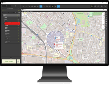 La entrada y salida de audio, así como el texto, se integran con dispositivos estándar como teclado, bocinas y micrófono. El despacho siempre está informado gracias a la visualización en tiempo real de usuarios en mapa, la gestión de mensajes de audio, imágenes y texto, y la recepción de alertas SOS. Las ubicaciones, actualizadas cada 10 segundos, permiten localizar al equipo de trabajo en cualquier momento. Todo bajo control.